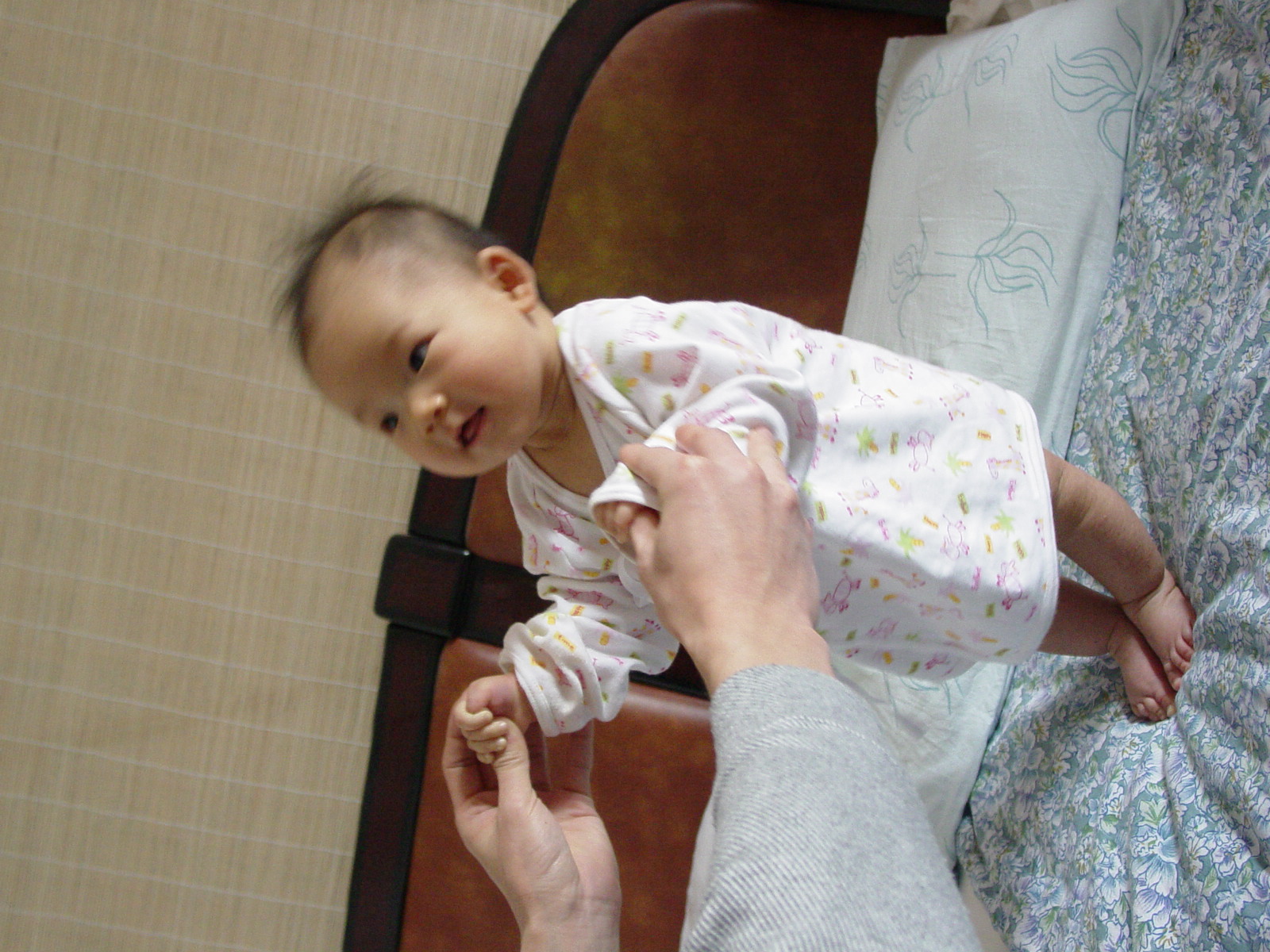 小朋友100 天的时候就能够歪歪扭扭的坐了,就是不太稳。在我们的搀扶下,还能够站起来
