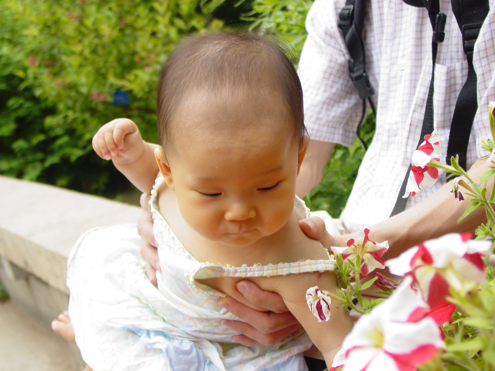 看花。在静斋的前面,小朋友看见花长得好看,便自己伸手去摸。有一回竟然图谋把一朵花