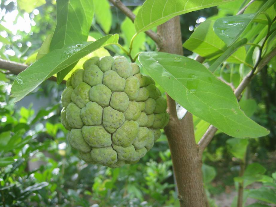 番荔枝,又名佛头果、释迦果。小乔木,半落叶,多分支。果肉乳白色,超级甜。2010年初种下的小苗,目前树龄两年半。第一次结果,两个大的,一个小的。