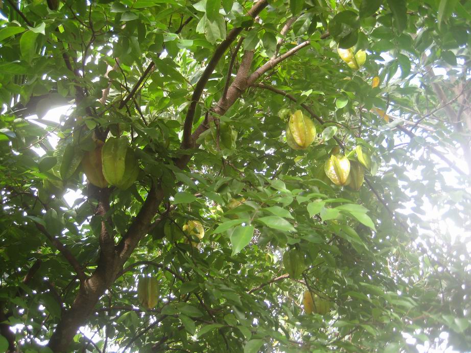 杨桃。常绿乔木,一年四季交互开花结果。杨桃有酸的树种,也有甜的树种。我这棵杨桃是甜的。2009年初种下的小苗,目前树龄三年半。杨桃第一年就可以开花结果,第一年的时候结果比较少,现在是越来越多了。
