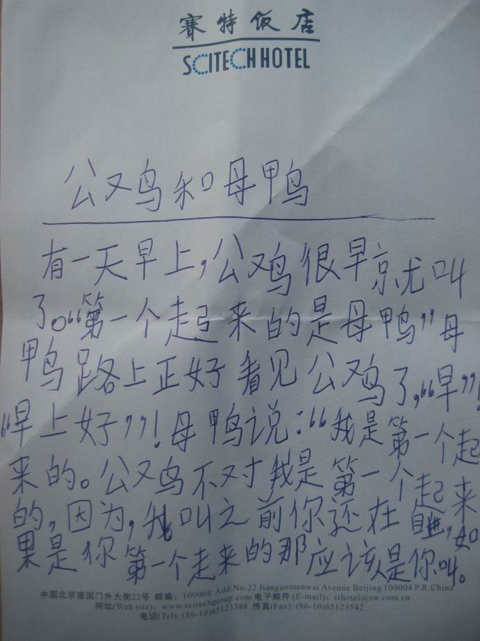 有一天早上,公鸡很早就叫了。“第一个起来的是母鸭”母鸭路上正好看见公鸡了。“早!”“早上好!”母鸭说:“我是第一个起来的”。公鸡说:“不对,我是第一个起来的。因为,我叫之前你还在睡。如果是你第一个起来的,那应该是你叫。”