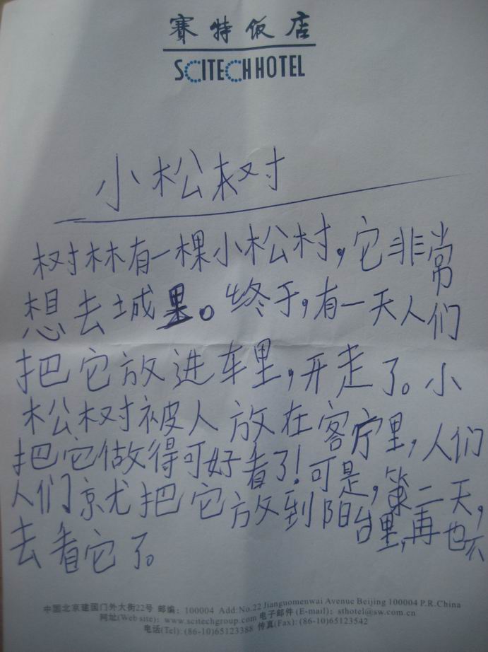树林有一颗小松树,它非常想去城里。终于,有一天人们把它放进车里,开走了。小松树被人放在客厅里,人们把它做得可好看了!可是,第二天,人们就把它放到阳台里,再也不去看它了。