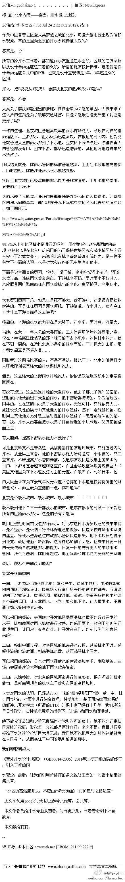 发表时间:2012-07-26 13:53:25北京的暴雨过后,给排水专业的guohaizao学长(本文称为郭学长)在水木社区发表了一个帖子,认为北京内涝的原因是排水能力过强。对此观点,本人表示不能赞同。