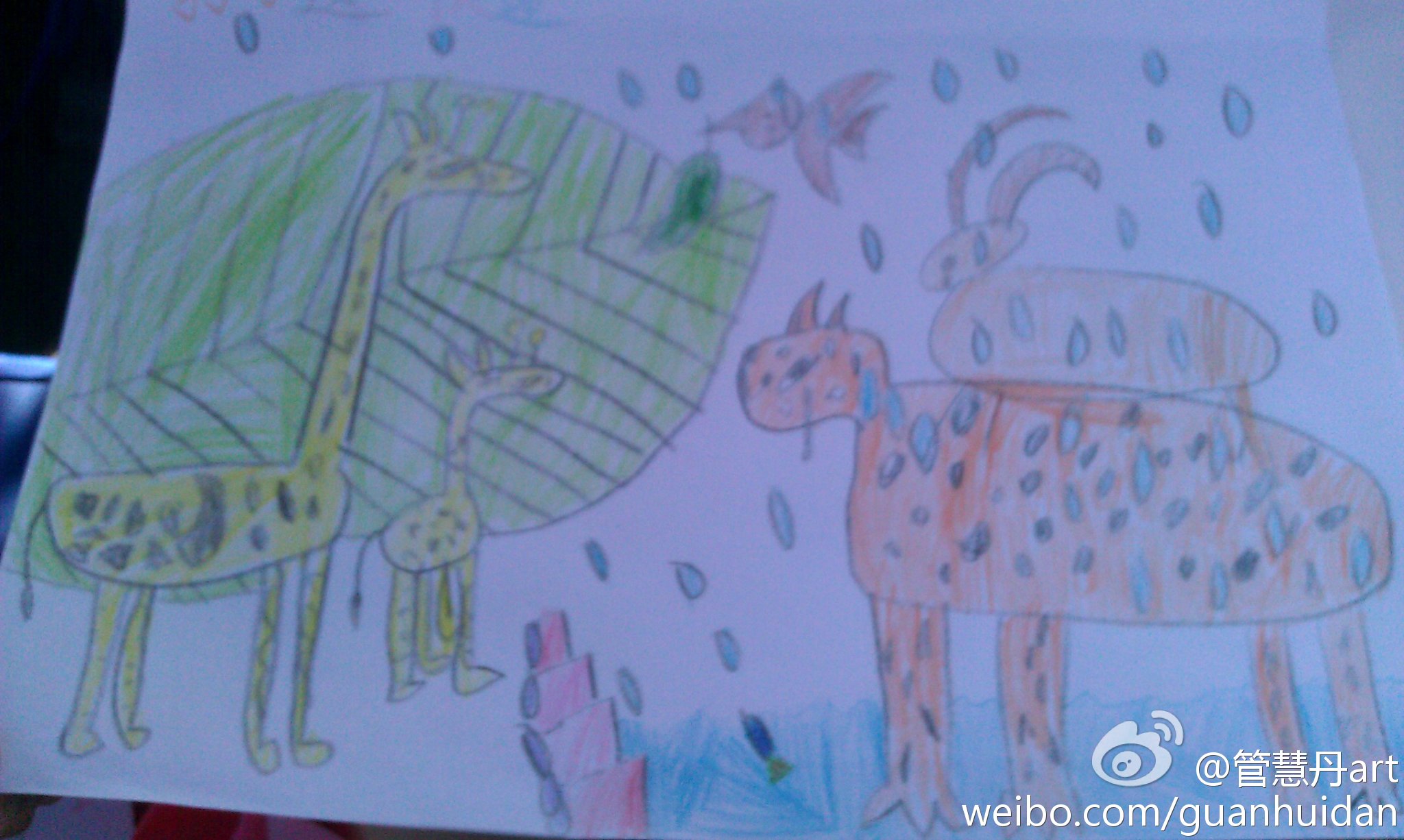 7 月21日北京下暴雨那天,爱多艺国际艺术教育中心的王子豹老师和李鹏歌老师在暴雨中背着婉清在从地铁站安全送回管老师家里。第二天,婉清在涂鸦的时候,管老师问:“你能否把昨天老师送你回来的场景画出来呢?”婉清就画了上面这幅《子豹送快递》。豹子(王子豹老师)驮着小羚羊(婉清自己),鸽子(李鹏歌老师)衔着一片小树叶挡雨。那片遮风挡雨的巨大的树叶,是管慧丹老师温暖的家。大叶子下面的母鹿是管慧丹老师,小鹿是管老师的娃娃大千……