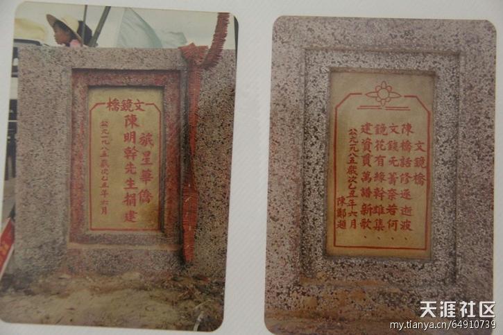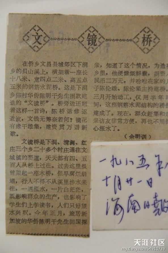 1950年,祖父到了马来西亚槟城,秉承曾祖父遗志,整理思路,为扩大经营范围,将公司迁往新加坡,从新开始、从头再来,起初生意销路、销量都是难题,但是他克服困难,发挥交际资源优势,很快走出瓶颈,后与法国、美国、英国、荷兰等人往来贸易,会讲多国语言,用心经营,生意逐日火旺。上个世纪七十年代,次祖母张氏不幸早逝,祖父再娶在新加坡生活的福建籍陈氏为妻,至此,祖父已娶三妻而生七子三女,家族庞大。生意起色后,祖父不忘救济在新加坡谋生的贫困老乡,十年如一日,每年都会邮寄大米、面粉和饼干回乡给乡亲父老和亲朋好友。对于祖父,我没有太多直观的印象,据长辈们描述,祖父气质过人、玉树临风、为人大方,既风流倜傥,言行又不失端庄。近几年,还乡探亲的新加坡华侨提起祖父,无一不竖起大拇指,有人说,他是才子,又是公子;也有人说,他好酒,常喝威士忌,经常以美酒接待来客,少用茶水,没有酒量的人一般不敢登门;还有人说,客人来访前,他会细心梳妆,以求仪容严整,表示对来访者的尊重,颇为讲究。今年春节,我回家过年,族人陈有业公告诉我,当年,祖父第一次还乡时,身着西装、打着领带、穿着黑皮鞋、梳着“鹩哥发”,走在文昌县城内,引众人围观,不时窃窃私语,指指点点……1985年夏,文镜桥落成通车之吉,祖父远在新加坡忙于生意,未能回来参加剪彩,更可惜的是之后他身患中风,与病魔抗争十余年而终,享年七旬有一岁,客葬新加坡,一直没有走过他斥资修建的桥……