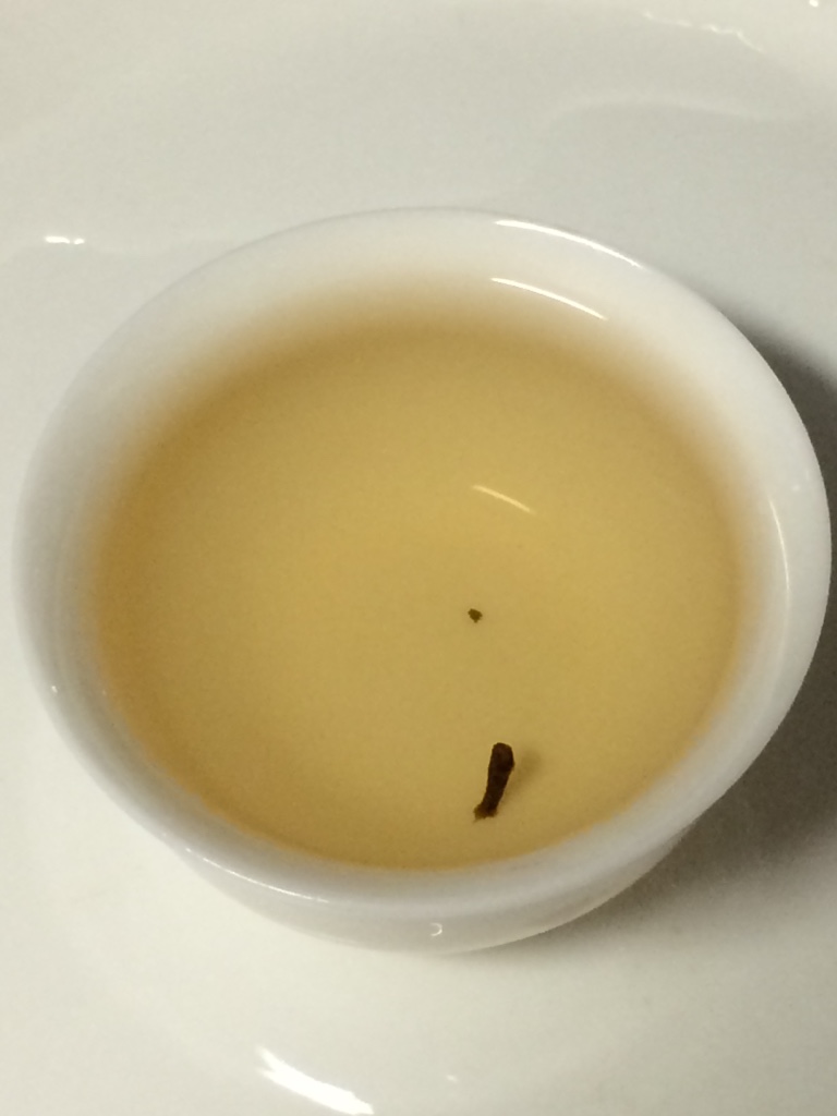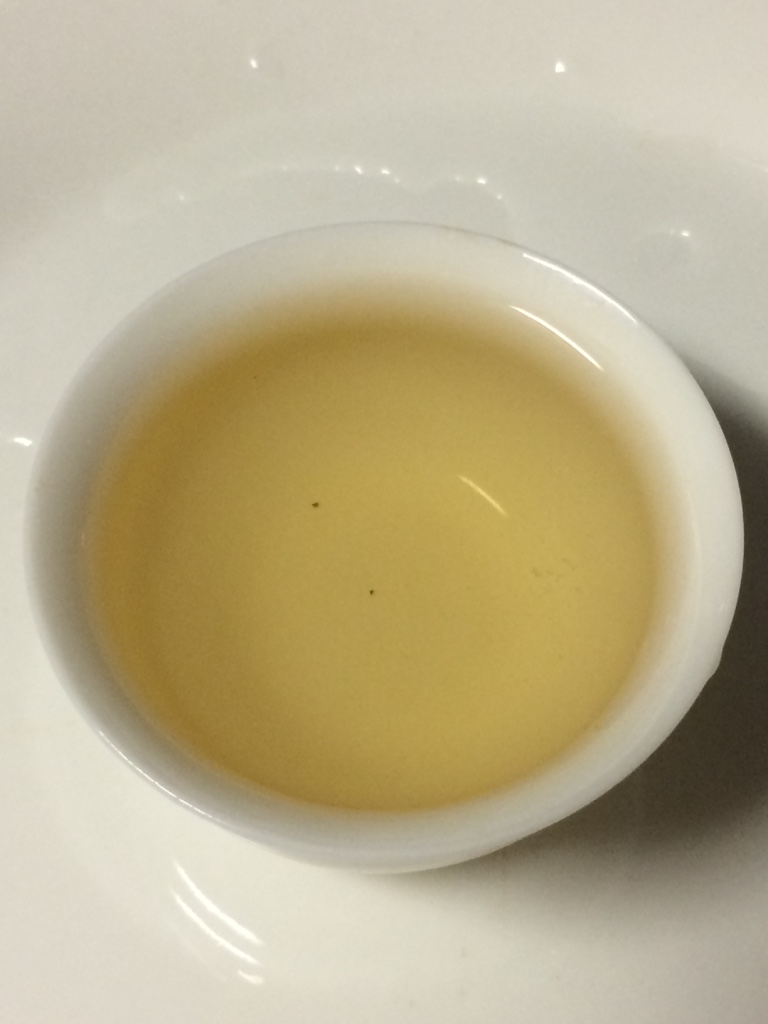 第一泡:水温大概为90度,注水后立即出汤,主要目的是醒茶。茶叶尚未伸展开来,木香浓郁。由于没有使用滤网,茶汤中有些许碎末,但是不影响茶汤质量。茶汤颜色极浅,淡黄色,轻闻有轻微花香,不显扬。入口滑爽,清甜,不苦不涩,10秒后有轻微的回甘。茶汤稍凉后,入口时甜味更加明显。