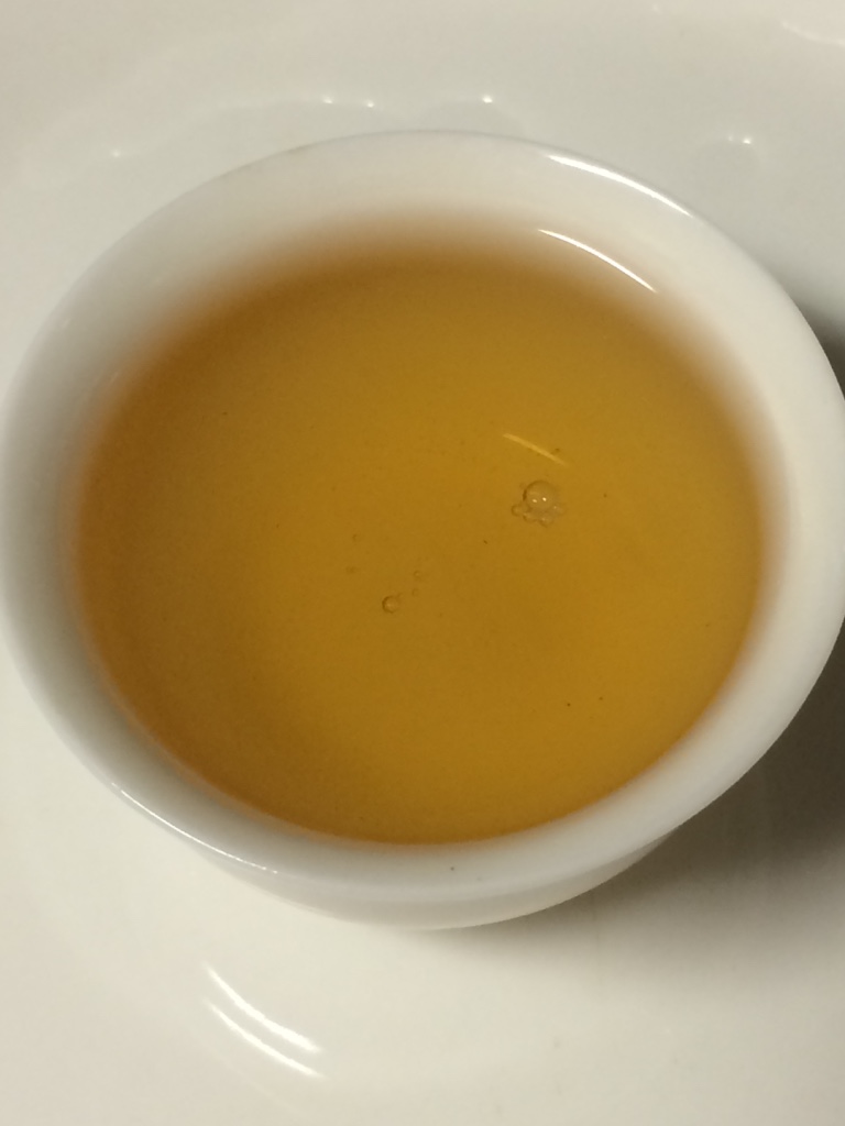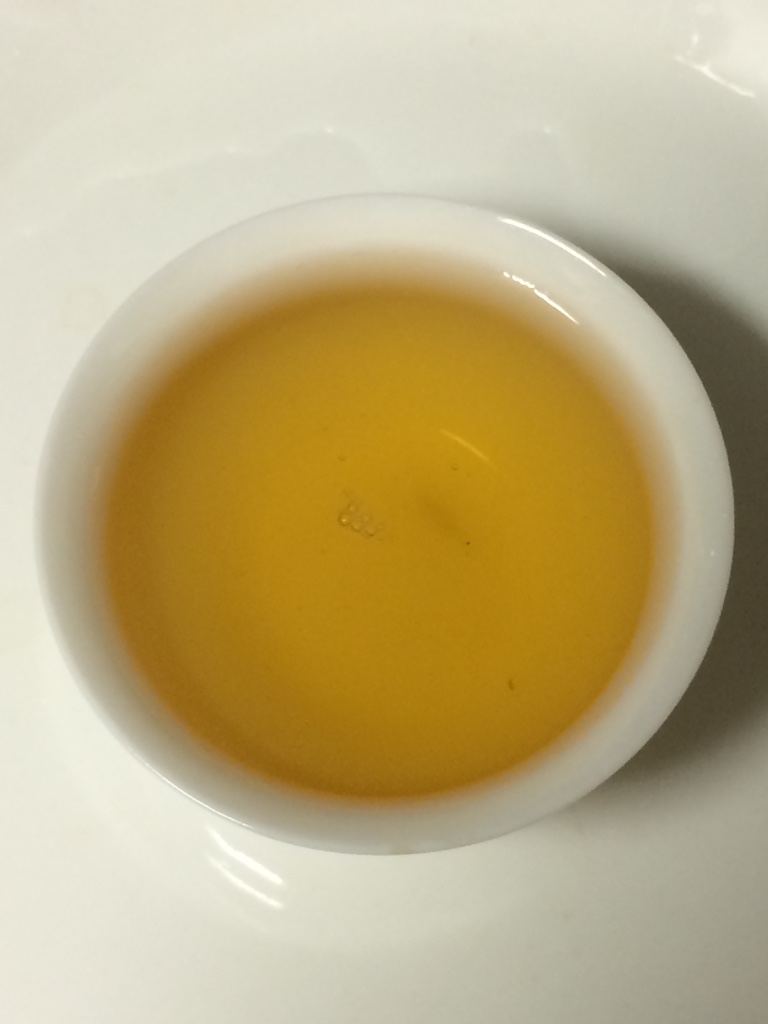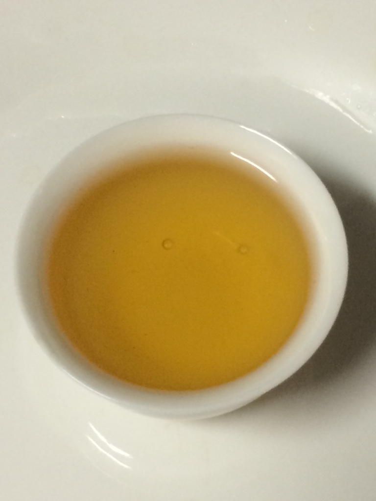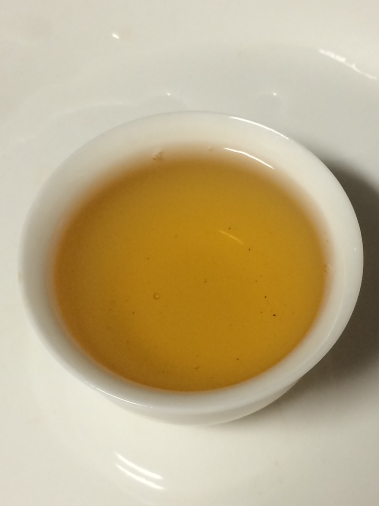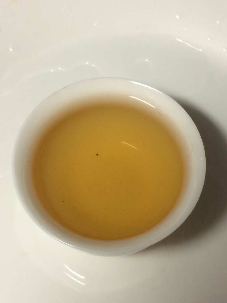 第五泡:水温100度,注水20秒后出汤。茶叶完全舒展,木香依然很浓。茶汤橙黄,花香不现。入口苦,苦后涩,苦涩很快消退。由舌底和喉咙开始生津回甘,随后蔓延至舌面和双颊。一分钟后双颊、舌底、舌根依次出现涩感,此后再次感觉生津与回甘。腹中有胀饱的感觉,开始打嗝。大约五分钟后,涩感全部消退,满口都是甜味。