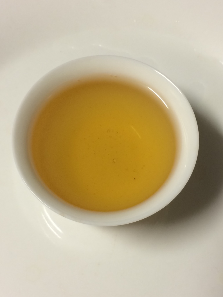 第三泡:水温100度,注水15秒后出汤。茶叶略显舒展,木香飞扬。茶汤橙黄,花香转淡。入口微苦微涩,下咽无锁喉感。苦味10秒后散去,舌底生津回甘,但是口腔和舌面依然有些许涩感。饮第二口时,有强烈的生津和回甘,满口都是甜味和花香,舌尖的甜味最为明显,整个口腔都有强烈的舒张感。饮后三五分钟左右,喉咙略觉干涩,舌尖、舌底、双颊依然有很甜的感觉,仔细体会时也略有涩感。